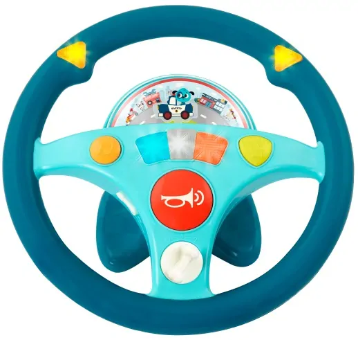 Interaktivní volant pro malého řidiče je ideální hračkou do autosedačky. Malý řidič může otáčením volantu pouštět blinkry. K řízení si může pustit písničku. Volant vydává i zvuky motoru a je vybaven houkačkou. Pod průhledným krytem je malé autíčko a pohybující se ulice města, autíčko ulicí jede dopředu nebo couvá.