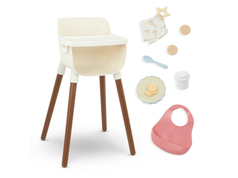 Stylová židlička s jídelním pultem umožní vašim dětem pohodlně usadit svou panenku a nakrmit ji pomocí bohaté sady doplňků, která obsahuje hrneček s odnímatelným víčkem, 2 sušenky, lžičku, misku ovesné kaše s banány, bryndáček a kousátko.